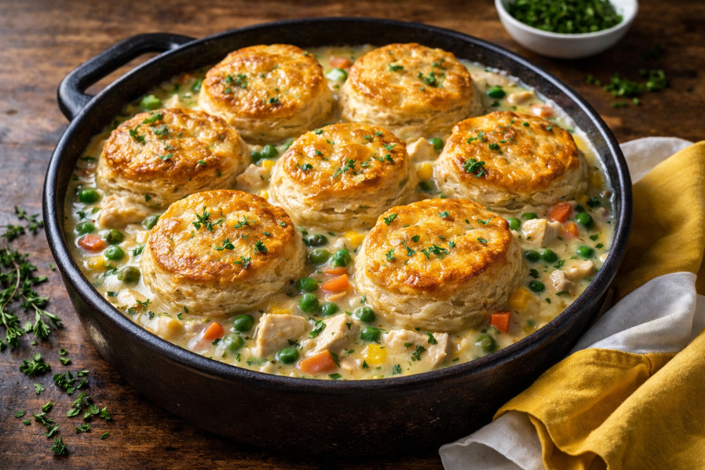 minutesThis Easy Homemade Chicken Pot Pie Casserole is a comforting, family-friendly dinner made with tender chicken, creamy sauce, and flaky biscuit topping. It delivers all the classic pot pie flavors in a simple, oven-baked casserole that’s perfect for busy weeknights.